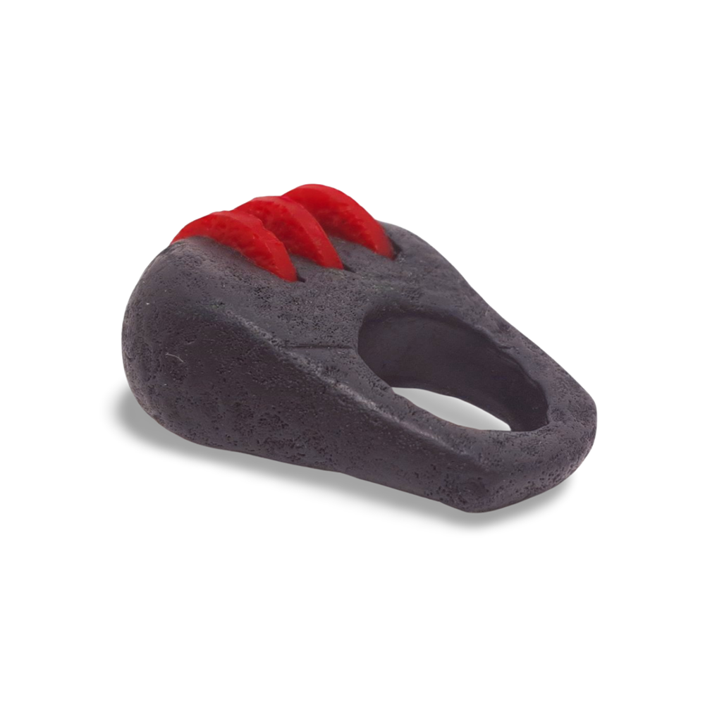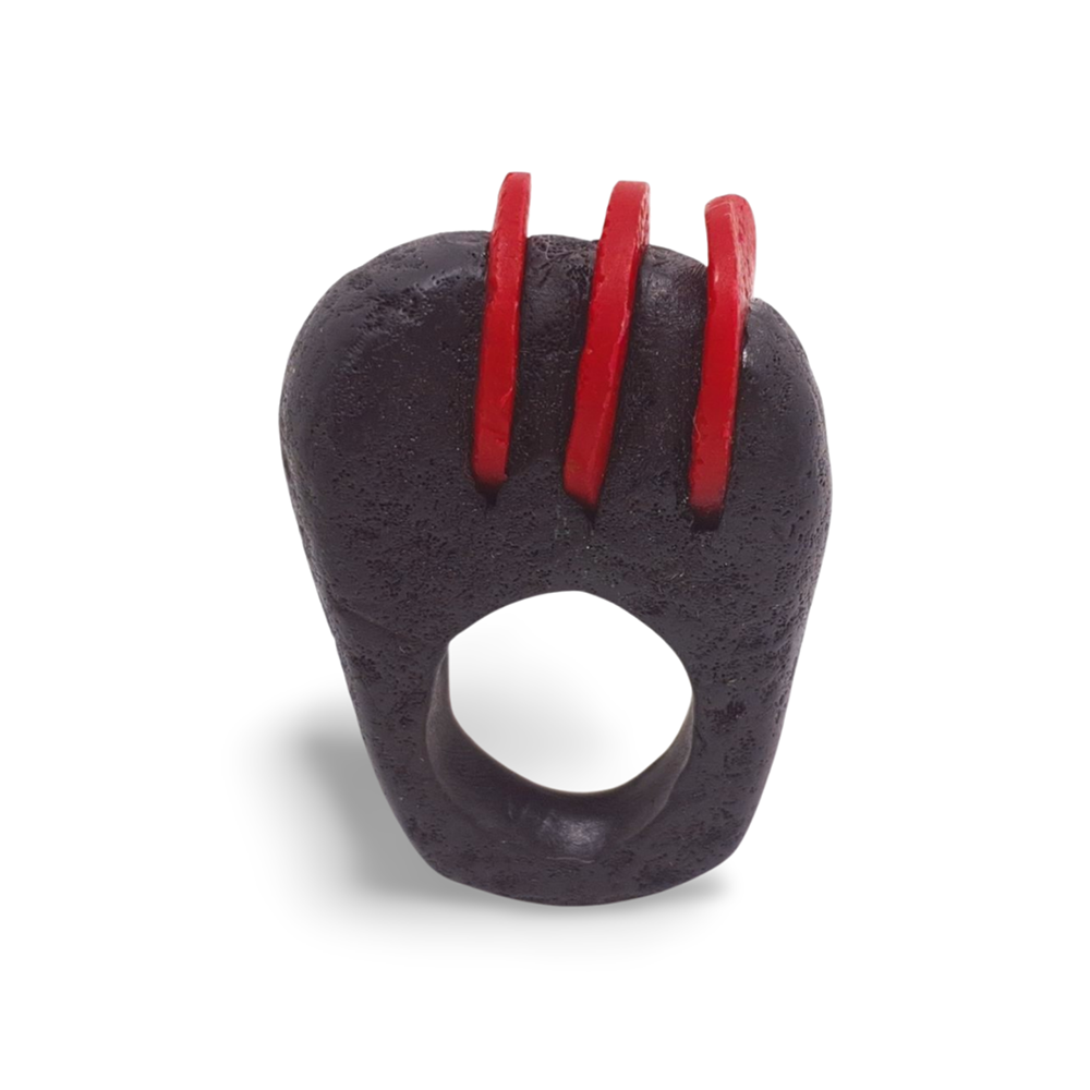 Anel escultural em polymer clay. Peça única, feita à mão, com visual marcante em preto e vermelho.