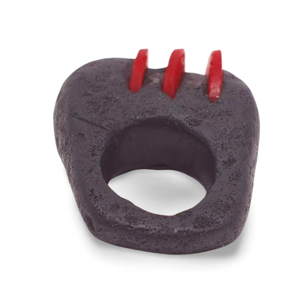 Este anel é uma expressão de contraste e intensidade. As formas vermelhas rompem a superfície escura como cicatrizes ou batidas visuais — representando ruptura, força e transformação. Uma peça para quem não passa despercebido(a), feita à mão como um manifesto silencioso em forma de acessório.